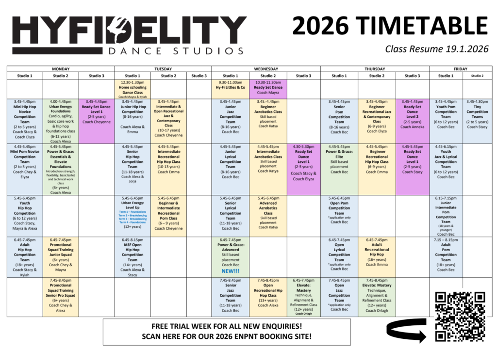 Our 2026 Timetable outlines all genres, age groups, and teams.